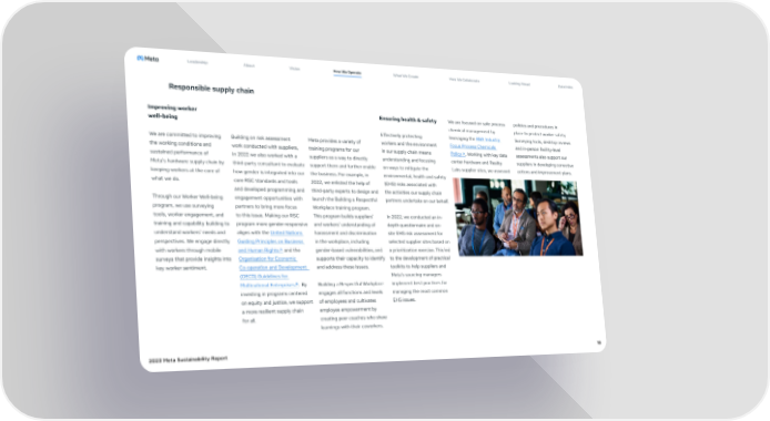 Leadership About Vision How We Operate What We Create How We Collaborate Looking Ahead Data Index Responsible supply chain Improving worker Ensuring health & safety We are focused on safe process policies and procedures in well-being chemical management by place to protect worker safety. Effectively protecting leveraging the RBA Industry Surveying tools, desktop reviews We are committed to improving Building on risk assessment Meta provides a variety of workers and the environment Focus Process Chemicals and in-person facility-level the working conditions and work conducted with suppliers, training programs for our in our supply chain means Policy↗. Working with key data assessments also support our sustained performance of in 2022 we also worked with a suppliers as a way to directly understanding and focusing center hardware and Reality suppliers in developing corrective Meta’s hardware supply chain by third-party consultant to evaluate support them and further enable on ways to mitigate the Labs supplier sites, we assessed actions and improvement plans. keeping workers at the core of how gender is integrated into our the business. For example, in environmental, health and safety what we do. core RSC standards and tools 2022, we enlisted the help of (EHS) risks associated with and developed programming and third-party experts to design and the activities our supply chain Through our Worker Well-being engagement opportunities with launch the Building a Respectful partners undertake on our behalf. program, we use surveying partners to bring more focus Workplace training program. tools, worker engagement, and to this issue. Making our RSC This program builds suppliers’ In 2022, we conducted an in- training and capability building to program more gender-responsive and workers’ understanding of depth questionnaire and on- understand workers’ needs and aligns with the United Nations harassment and discrimination site EHS risk assessment for perspectives. We engage directly Guiding Principles on Business in the workplace, including selected supplier sites based on with workers through mobile and Human Rights↗ and the gender-based vulnerabilities, and a prioritization exercise. This led surveys that provide insights into Organisation for Economic supports their capacity to identify to the development of practical key worker sentiment. Co-operation and Development and address these issues. toolkits to help suppliers and (OECD) Guidelines for Meta’s sourcing managers Multinational Enterprises↗. By Building a Respectful Workplace implement best practices for investing in programs centered engages all functions and levels managing the most common on equity and justice, we support of employees and cultivates EHS issues. a more resilient supply chain employee empowerment by for all. creating peer coaches who share learnings with their coworkers. 2023 Meta Sustainability Report 18