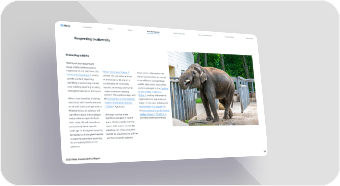 Leadership About Vision How We Operate What We Create How We Collaborate Looking Ahead Data Index Respecting biodiversity Protecting wildlife Meta’s policies help prevent illegal wildlife trafficking from happening on our platforms. Our Meta’s Commerce Policies↗ Cross-sector collaboration and Community Standards↗ strictly prohibit the sale of live animals industry partnerships are crucial prohibit content depicting, or animal parts. We rely on a in our efforts to combat illegal admitting or promoting criminal combination of community wildlife sales online. Since 2018, acts including poaching or selling reports, technology and human we have belonged to the Coalition endangered species or their parts. review to remove violating to End Wildlife Trafficking content. These policies align with Online↗, working with external When a user searches a hashtag the Convention on International organizations to help scale our associated with harmful behavior Trade in Endangered Species impact in this area, including the to animals, such as #tigerselfie or (CITES)↗ Appendix I. World Wildlife Fund (WWF)↗, #elephantivory, an advisory will the International Fund for Animal warn them about these dangers Although we have made Welfare (IFAW)↗, TRAFFIC↗, and provide an opportunity to significant progress in recent and other leading businesses. learn more. We will sometimes years, this is a rapidly evolving permanently block specific space, with traders constantly hashtags on Instagram known to adapting and obfuscating their be related to endangered species tactics to circumvent our policies to prevent users from searching and fool detection systems. for or creating them on the platform. 2023 Meta Sustainability Report 28