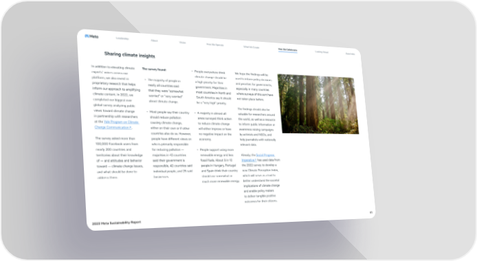 Leadership About Vision How We Operate What We Create How We Collaborate Looking Ahead Data Index Sharing climate insights In addition to elevating climate The survey found: • People everywhere think We hope the findings will be experts’ voices across our climate change should be used to inform policy decisions platform, we also invest in • The majority of people in a high priority for their and priorities for governments, proprietary research that helps nearly all countries said government. Majorities in especially in many countries inform our approach to amplifying that they were “somewhat most countries in North and where surveys of this sort have climate content. In 2022, we worried” or “very worried” South America say it should not taken place before. completed our biggest ever about climate change. be a “very high” priority. global survey analyzing public The findings should also be views toward climate change • Most people say their country • A majority in almost all valuable for researchers around in partnership with researchers should reduce pollution areas surveyed think action the world, as well as a resource at the Yale Program on Climate causing climate change, to reduce climate change to inform public information or Change Communication↗. either on their own or if other will either improve or have awareness raising campaigns countries also do so. However, no negative impact on the by activists and NGOs, and The survey asked more than people have different views on economy. help journalists with nationally 100,000 Facebook users from who is primarily responsible relevant data. nearly 200 countries and for reducing pollution — • People support using more territories about their knowledge majorities in 43 countries renewable energy and less Already, the Social Progress of — and attitudes and behavior said their government is fossil fuels. About 9 in 10 Imperative↗ has used data from toward — climate change issues, responsible, 42 countries said people in Hungary, Portugal the 2022 survey to develop a and what should be done to individual people, and 25 said and Spain think their country new Climate Perception Index, address them. businesses. should use somewhat or which will serve as a tool to much more renewable energy. better understand the societal implications of climate change and enable policy makers to deliver tangible positive outcomes for their citizens. 2023 Meta Sustainability Report 41