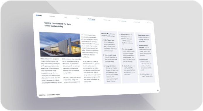 Leadership About Vision How We Operate What We Create How We Collaborate Looking Ahead Data Index Setting the standard for data center sustainability Meta’s top 10 sustainability 4. Eliminate waste. Use less 7. Support electric vehicles. conserve energy and water, priorities for data centers stuff to begin with and Provide infrastructure to reduce waste, treat our land promote a zero-waste encourage carbon-free and communities with respect, 1. Push efficiency first. culture by reusing and transportation. responsibly source materials, Aim to drive energy recycling as much as we and provide healthy workspaces and water efficiencies can. 8. Measure and report for our people. Together, this with advanced IT and our impact. Track and comprehensive approach has mechanical, electrical and 5. Buy better products. report our environmental led to 100% of our operational plumbing design. Improve visibility into our impacts linked to data data center buildings earning, construction materials center construction and at minimum, LEED Gold 2. Use renewable energy. supply chain and source operations. certification. Continue supporting our building products that Meta's data centers are part of GHG emissions. Also responsible data centers with 100% have a low GHG footprint 9. Drive innovation. the global infrastructure that for the highest percentage of As we look to the future, we renewable energy. and safe chemistry. Experiment with new brings our current technologies Meta water use, operational have streamlined our approach technologies and build to life and supports immersive data centers rely on water for to data centers to a new 3. Be a good neighbor. 6. Boost wellness. Create social value by sharing experiences in the metaverse. evaporative cooling during architecture that we believe Minimize our impact to healthy, delightful our successes with the And, supported by 100% summers and humidification will be more cost-efficient and the land, air, water, noise workspaces that foster world. renewable energy, they are during winters. more flexible. This pivot in and atmosphere, and employee wellness and among the most advanced and design will set us up to support prioritize sustainability productivity. 10. Focus on impact. Stay efficient in the world. Our data We have a strong track record both artificial intelligence (AI) strategies most true to these principles. centers generate the highest incorporating design and and non-AI workloads at our important to a region’s percentage of our energy use and construction strategies that data centers. unique character. 2023 Meta Sustainability Report 22