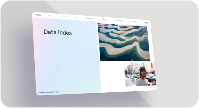 Meta 2023 Sustainability Report Page 42 Page 44Leadership About Vision How We Operate What We Create How We Collaborate Looking Ahead Data Index Data index 2023 Meta Sustainability Report 43