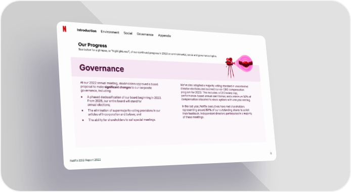 Introduction Environment Social Governance Appendix Our Progress See below for a glimpse, or “highlights reel”, of our continued progress in 2022 on environmental, social and governance topics. Governance At our 2022 annual meeting, stockholders approved a board We’ve also adopted a majority voting standard in uncontested proposal to make significant changes to our corporate director elections and evolved our co-CEO compensation governance, including: program for 2023. This includes: a CEO salary cap; performance-based annual cash bonus; and a minimum 50% of ● A phased declassification of our board beginning in 2023. compensation allocated to stock options with one year vesting. From 2025, our entire board will stand for annual elections; In the last year, Netflix executives have met shareholders representing around 51% of our outstanding shares to solicit ● The elimination of supermajority voting provisions in our their feedback. Independent directors participated in a majority articles of incorporation and bylaws; and of these meetings. ● The ability for shareholders to call special meetings. Netflix ESG Report 2022 8