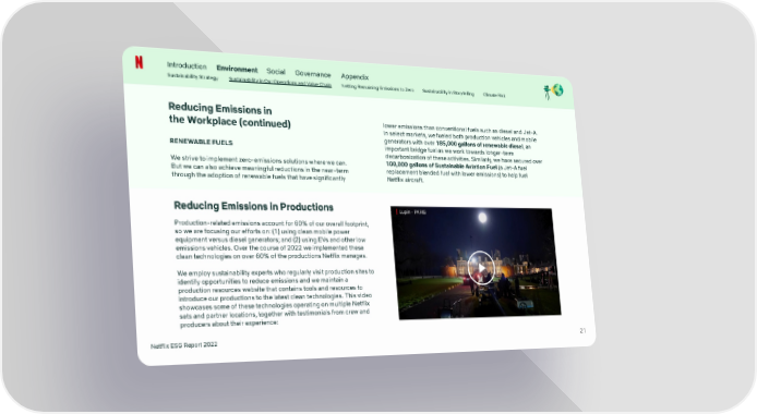 Introduction Environment Social Governance Appendix Sustainability Strategy Sustainability in Our Operations and Value Chain Netting Remaining Emissions to Zero Sustainability in Storytelling Climate Risk Reducing Emissions in lower emissions than conventional fuels such as diesel and Jet-A. the Workplace (continued) In select markets, we fueled both production vehicles and mobile generators with over 185,000 gallons of renewable diesel, an important bridge fuel as we work towards longer-term RENEWABLE FUELS decarbonization of these activities. Similarly, we have secured over 100,000 gallons of Sustainable Aviation Fuel (a Jet-A fuel We strive to implement zero-emissions solutions where we can. replacement blended fuel with lower emissions) to help fuel But we can also achieve meaningful reductions in the near-term Netflix aircraft. through the adoption of renewable fuels that have significantly Reducing Emissions in Productions Production-related emissions account for 60% of our overall footprint, so we are focusing our efforts on: (1) using clean mobile power equipment versus diesel generators; and (2) using EVs and other low emissions vehicles. Over the course of 2022 we implemented these clean technologies on over 60% of the productions Netflix manages. We employ sustainability experts who regularly visit production sites to identify opportunities to reduce emissions and we maintain a production resources website that contains tools and resources to introduce our productions to the latest clean technologies. This video showcases some of these technologies operating on multiple Netflix sets and partner locations, together with testimonials from crew and producers about their experience: Netflix ESG Report 2022 21