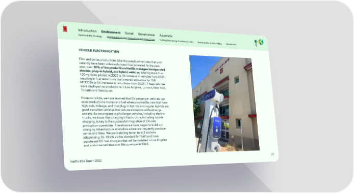 Introduction Environment Social Governance Appendix Sustainability Strategy Sustainability in Our Operations and Value Chain Netting Remaining Emissions to Zero Sustainability in Storytelling Climate Risk VEHICLE ELECTRIFICATION Film and series productions take thousands of vehicles that until recently have been universally fossil-fuel powered. In the past year, over 30% of the productions Netflix manages incorporated electric, plug-in hybrid, and hybrid vehicles, totaling more than 120 vehicles piloted in 2022 (a 3X increase in vehicles from 2021), resulting in fuel reductions that lowered emissions by 158 MTCO2e (a 5X increase in reductions from 2021). These vehicles were deployed on productions in Los Angeles, London, New York, Toronto and Vancouver. From our pilots, we have learned that EV passenger vehicles can save productions money and fuel when provided to crew that have high daily mileage, and that plug-in hybrids and regular hybrids are good transition vehicles that reduce emissions without range anxiety. As we prepare to pilot larger vehicles, including electric trucks, we know that charging infrastructure, including mobile charging, is key to the successful integration of EVs into production operations. Therefore we have begun to build out charging infrastructure at studios where we frequently produce series and films. We are installing faster level 2 stations (dispensing 16-19 kW vs the standard 6-7 kW) and have purchased DC fast chargers that will be installed in Los Angeles and at our owned studio in Albuquerque in 2023. Netflix ESG Report 2022 23