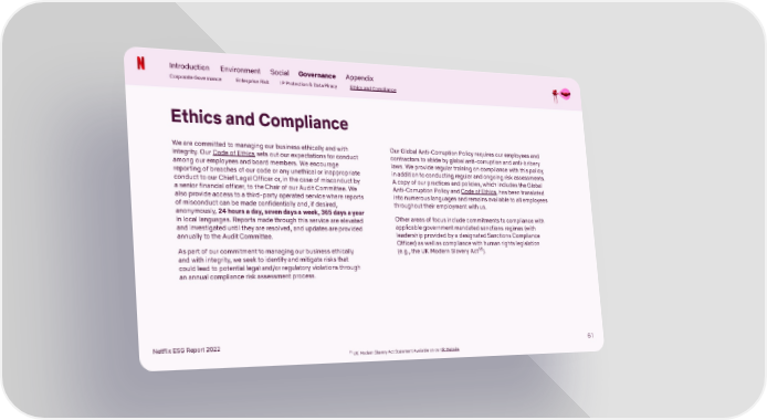 Introduction Environment Social Governance Appendix Corporate Governance Enterprise Risk IP Protection & Data Piracy Ethics and Compliance Ethics and Compliance We are committed to managing our business ethically and with Our Global Anti-Corruption Policy requires our employees and integrity. Our Code of Ethics sets out our expectations for conduct contractors to abide by global anti-corruption and anti-bribery among our employees and board members. We encourage laws. We provide regular training on compliance with this policy, reporting of breaches of our code or any unethical or inappropriate in addition to conducting regular and ongoing risk assessments. conduct to our Chief Legal Officer or, in the case of misconduct by A copy of our practices and policies, which includes the Global a senior financial officer, to the Chair of our Audit Committee. We Anti-Corruption Policy and Code of Ethics, has been translated also provide access to a third-party operated service where reports into numerous languages and remains available to all employees of misconduct can be made confidentially and, if desired, throughout their employment with us. anonymously, 24 hours a day, seven days a week, 365 days a year Other areas of focus include commitments to compliance with in local languages. Reports made through this service are elevated applicable government mandated sanctions regimes (with and investigated until they are resolved, and updates are provided leadership provided by a designated Sanctions Compliance annually to the Audit Committee. Officer) as well as compliance with human rights legislation 35 As part of our commitment to managing our business ethically (e.g., the UK Modern Slavery Act ). and with integrity, we seek to identify and mitigate risks that could lead to potential legal and/or regulatory violations through an annual compliance risk assessment process. Netflix ESG Report 2022 61 35 UK Modern Slavery Act Statement Available on our IR Website