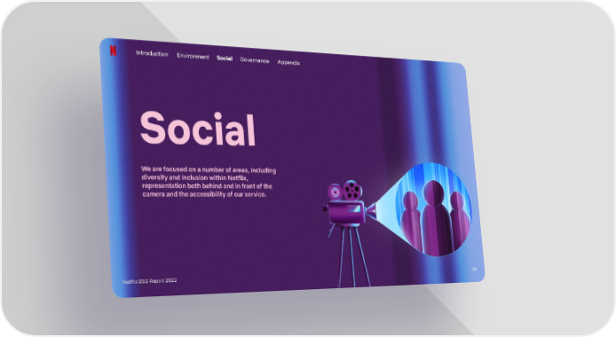 Introduction Environment Social Governance Appendix Social We are focused on a number of areas, including diversity and inclusion within Netflix, representation both behind and in front of the camera and the accessibility of our service. Netflix ESG Report 2022 36
