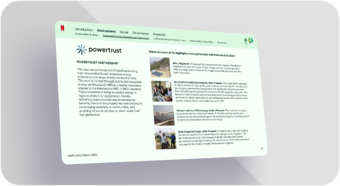 Introduction Environment Social Governance Appendix Sustainability Strategy Sustainability in Our Operations and Value Chain Netting Remaining Emissions to Zero Sustainability in Storytelling Climate Risk Below are some of the highlights of our partnership with Powertrust in 2022: Mon, Nagaland: This project has connected three villages in the state of POWERTRUST PARTNERSHIP Nagaland to solar mini-grids. These villages are the first demonstration sites of a larger plan to connect 40 villages across the province over the next three years. This year we partnered with Powertrust to bring high-impact distributed renewable energy projects to rural areas of India for the first time. Dr. Shroff’s Charity Eye Hospital, Uttar Pradesh: This organization operates This work is funded through distributed renewable multiple centers for high-quality, low-cost eye care serving the rural poor and energy certificates (D-RECs), a market instrument low-income communities across India. The combined network sees more aligned to the International REC (I-REC) standard. than 250,000 patients and performs nearly 30,000 surgeries every year. This These investments bring renewable energy to branch in Uttar Pradesh experienced daily power cuts lasting multiple hours, regions where it is needed most, thereby and relied on diesel generators to provide backup power. Now, a photovoltaic delivering maximal social and environmental system reduces diesel consumption by up to 70%. benefits. Many of the projects we have invested in are bringing electricity to communities, and Vellore Institute of Technology, Andhra Pradesh: The institute is a higher enabling others to rely less on small-scale fossil educational facility in Andhra Pradesh. A 700kWp rooftop system now fuel generators. spreads across several buildings on the institute’s campus, including several student accommodation and service buildings. Solar Irrigation Pumps, Uttar Pradesh: “Irrigation-as-a-Service” enables farmers to transition from diesel-based pumping to solar irrigation. The tariffs are set to be 20-40% cheaper than the running cost of diesel groundwater pumping (including fuel, maintenance, and rental), and users only pay for the volume of water consumed for irrigation. Netflix ESG Report 2022 20