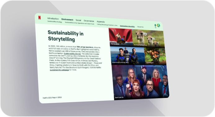 Introduction Environment Social Governance Appendix Sustainability Strategy Sustainability in Our Operations and Value Chain Netting Remaining Emissions to Zero Sustainability in Storytelling Climate Risk Sustainability in Storytelling The Sea Beast Our Great National Parks In 2022, 165 million, or more than 70% of our members, chose to watch at least one story on Netflix that highlighted sustainability. We’ve curated over 200 of these series, films and specials into a Netflix collection: Sustainability Stories. The collection includes comedies like Don’t Look Up, documentaries like the Academy Award® winning The Elephant Whisperers and Our Great National Parks, to the mystery film Glass Onion: A Knives Out Mystery, Down to Earth with Zac Efron Spirit Rangers fantasy sci-fi Sweet Tooth and political drama Borgen - Power and Glory, inspiring solutions in Down to Earth with Zac Efron, and family fare like The Sea Beast and Spirit Rangers. Visit the Netflix sustainability webpage for more. Netflix ESG Report 2022 31 Don’t Look Up