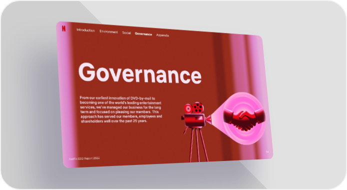Introduction Environment Social Governance Appendix Governance From our earliest innovation of DVD-by-mail to becoming one of the world’s leading entertainment services, we’ve managed our business for the long term and focused on pleasing our members. This approach has served our members, employees and shareholders well over the past 25 years. Netflix ESG Report 2022 54
