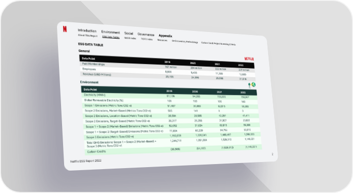 Introduction Environment Social Governance Appendix About This Report ESG Data Tables SASB Index TCFD Index Resources GHG Inventory Methodology Carbon Credit Project Screening Criteria ESG DATA TABLE General Data Point 2019 2020 2021 2022 Paid Memberships 167 million 204 million 222 million 231 million Employees 8,600 9,400 11,300 12,800 Revenue (USD Millions) 20,156 24,996 26,698 31,616 Environment Data Point 2019 2020 2021 2022 Electricity (MWH) 81,136 94,285 156,555 156,967 Global Renewable Electricity (%) 100 100 100 100 Scope 1 Emissions (Metric Tons C02-e) 51,487 30,883 62,815 59,388 Scope 2 Emissions, Market-Based (Metrics Tons C02-e) 565 141 0 0 Scope 2 Emissions, Location-Based (Metric Tons C02-e) 26,594 28,585 42,291 41,411 Scope 2 Emissions, Target-Based (Metric Tons C02-e) 26,317 29,356 31,937 23,622 Scope 1 + Scope 2 (Market-Based) Emissions (Metric Tons C02-e) 52,052 31,024 62,815 59,388 Scope 1 + Scope 2 (Target-Based) Emissions (Metric Tons C02-e) 77,804 60,239 94,752 83,010 Scope 3 Emissions (Metric Tons C02-e) 1,192,659 1,020,541 1,466,497 1,086,833 Total GHG Emissions: Scope 1 + Scope 2 (Market-Based) + 1,244,711 1,051,564 1,529,312 1,146,221 Scope 3 (Metric Tons C02-e) Carbon Credits (36,506) (54,107) (1,529,312) (1,146,221) Netflix ESG Report 2022 2