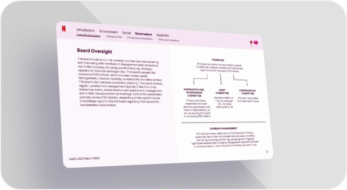 Introduction Environment Social Governance Appendix Corporate Governance Enterprise Risk IP Protection & Data Piracy Ethics and Compliance Board Oversight THE BOARD The board as a whole oversees matters related The board’s role in our risk oversight process includes reviewing to enterprise, strategic, operational, financial and and discussing with members of management areas of material legal risk and the company’s ESG efforts. risk to the company, including overall enterprise, strategic, operational, financial and legal risks. The board oversees the company’s ESG efforts, which includes human capital management, inclusion, diversity, sustainability and other matters. The board also oversees succession planning. The board receives regular updates from management typically in the form of an NOMINATING AND AUDIT COMPENSATION interactive memo, where directors ask questions to management, GOVERNANCE COMMITTEE COMMITTEE and further discuss matters at meetings. Each of the committees COMMITTEE Oversees matters of Oversees risks related oversee various ESG matters, depending on the specific issues. Primary committee financial and legal to compensation issues Committees report to the full board regarding their respective responsible for board risk, including considerations and actions. structure, governance and cybersecurity risk director independence, as well as assisting the board in overseeing ESG matters COMPANY MANAGEMENT The executive team, led by our co-Chief Executive Officers, supervises day-to-day risk management processes, including identifying, assessing, monitoring, managing and mitigating significant business risks. Company management reports to the board on an annual basis, or more frequently if needed, top areas of risk. Netflix ESG Report 2022 57