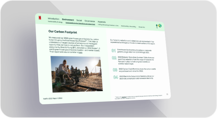 Introduction Environment Social Governance Appendix Sustainability Strategy Sustainability in Our Operations and Value Chain Netting Remaining Emissions to Zero Sustainability in Storytelling Climate Risk Our Carbon Footprint We measured our 2022 greenhouse gas emissions (i.e., carbon Our footprint, reductions and related data are represented in four 14 footprint) using the Greenhouse Gas Protocol . This helps us separate tables throughout the environment section of this report: understand our largest sources of emissions and the biggest opportunities we have to reduce them. Our independent accountants, Ernst & Young (EY), reviewed our 2022 Scope 1, 2 Greenhouse Gas Inventory including our corporate and 3 greenhouse gas emissions (location- and market-based). greenhouse gas data from 2019 through 2022. Their report and assurance letter is here. 2022 Emission Reductions Summary Table shows our quantified reductions from the range of measures we have put in place to track progress towards our science-based target. 2022 Carbon Credit Portfolio shows the carbon credits we purchased and retired for 2022. 2022 Electricity Consumption Summary shows our electricity consumption and renewable electricity. Netflix ESG Report 2022 15 14 Refer to the appendix for details about our greenhouse gas emissions inventory methodology, footprint boundaries and data management process.