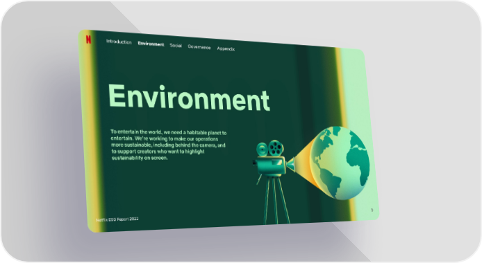 Introduction Environment Social Governance Appendix Environment To entertain the world, we need a habitable planet to entertain. We’re working to make our operations more sustainable, including behind the camera, and to support creators who want to highlight sustainability on screen. Netflix ESG Report 2022 9