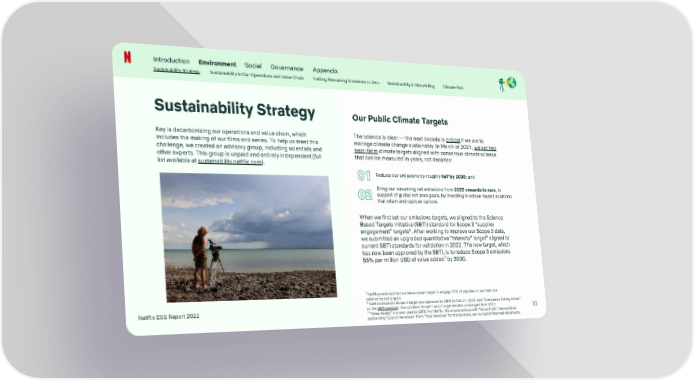 Introduction Environment Social Governance Appendix Sustainability Strategy Sustainability in Our Operations and Value Chain Netting Remaining Emissions to Zero Sustainability in Storytelling Climate Risk Sustainability Strategy Our Public Climate Targets The science is clear — the next decade is critical if we are to Key is decarbonizing our operations and value chain, which manage climate change sustainably. In March of 2021, we set two includes the making of our films and series. To help us meet this near-term climate targets aligned with consensus climate science challenge, we created an advisory group, including scientists and that can be measured in years, not decades: other experts. This group is unpaid and entirely independent (full list available at sustainability.netflix.com). Reduce our emissions by roughly half by 2030; and Bring our remaining net emissions from 2022 onwards to zero, in support of global net zero goals, by investing in nature-based solutions that retain and capture carbon. When we first set our emissions targets, we aligned to the Science Based Targets Initiative (SBTi) standard for Scope 3 “supplier 5 engagement” targets . After working to improve our Scope 3 data, 6 we submitted an upgraded quantitative “intensity” target aligned to current SBTi standards for validation in 2022. The new target, which has now been approved by the SBTi, is to reduce Scope 3 emissions 7 55% per million USD of value added by 2030. 5 Netflix previously had a science-based target to engage 70% of suppliers to set their own science-based targets. 6 Netflix’s Intensity Scope 3 target was approved by SBTi on Feb 27, 2023 (see “Companies Taking Action” on the SBTi website). Our validated Scope 1 and 2 target remains unchanged from 2021. Netflix ESG Report 2022 10 7 “Value Added” is a term used by SBTi. For Netflix, this is synonymous with “Gross Profit,” derived from subtracting “Cost of Revenues” from “Total Revenue” for the business, per our public financial statements.
