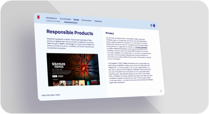 Introduction Environment Social Governance Appendix Inclusion and Diversity Responsible Products Privacy Responsible Products Our service has always been subscription-based, and when members sign up for any plan, we ask for very little information: Empowering people to easily choose and experience films, email, name and method of payment. Our Personal Information series and games they love is critical to a member’s joy every Handling Principles ensure our engineering and business teams time they go to Netflix. We design our products to protect the are aligned on our approach to privacy. Our Privacy Statement privacy and security of our members, and to be inclusive and provides a detailed explanation of our privacy practices to our accessible to everyone. members, including: the information Netflix collects or receives from each member; information from our partners; how we use and disclose it (including advertising that we conduct off Netflix to promote our service); and the controls each member has in relation to this information. In November of 2022, Netflix introduced an ad-supported plan which allows members to enjoy our service at a lower price with limited ads. For those signing up for our ad-supported plan, we also ask for date of birth and gender. Members have the ability to opt-out of the selection of ads based on third party behavioral advertising (i.e., ads selected based on use and/or interactions with unaffiliated third party websites and apps over time). We offer members the ability to exercise such opt-outs through a simple in-service control — and we do not share what individual members watch with advertisers. Netflix ESG Report 2022 50