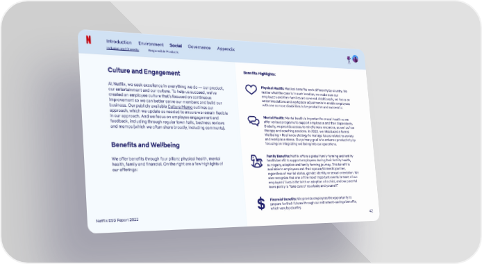 Introduction Environment Social Governance Appendix Inclusion and Diversity Responsible Products Benefits Highlights: Culture and Engagement Physical Health: Medical benefits work differently by country. No At Netflix, we seek excellence in everything we do — our product, matter what the case is in each location, we make sure our our entertainment and our culture. To help us succeed, we’ve employees and their families are covered. Additionally, we focus on created an employee culture that’s focused on continuous accommodations and workplace adjustments to enable employees improvement so we can better serve our members and build our with one or more disabilities to be productive and successful. business. Our publicly available Culture Memo outlines our approach, which we update as needed to ensure we remain flexible Mental Health: Mental health is important to overall health so we in our approach. And we focus on employee engagement and offer various programs to support employees and their dependents. feedback, including through regular town halls, business reviews Globally, we provide access to mindfulness resources, as well as free and memos (which we often share broadly, including comments). therapy and coaching sessions. In 2022, we introduced a formal Wellbeing + Resilience strategy to manage issues related to anxiety and workplace stress. Our primary goal is to enhance productivity by focusing on integrating wellbeing into our operations. Benefits and Wellbeing Family Benefits: Netflix offers a global family forming and fertility We offer benefits through four pillars: physical health, mental health benefit to support employees during their fertility health, health, family and financial. On the right are a few highlights of surrogacy, adoption and family forming journey. This benefit is our offerings: available to employees and their spouse/domestic partner, regardless of marital status, gender identity or sexual orientation. We also recognize that one of the most important events in many of our employees’ lives is the birth or adoption of a child, and our parental leave policy is “take care of your baby and yourself.” Financial Benefits: We provide employees the opportunity to prepare for their futures through our retirement-savings benefits, which vary by country. Netflix ESG Report 2022 42