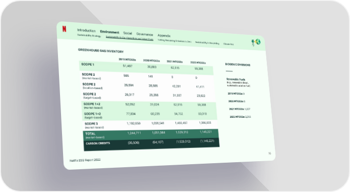 Introduction Environment Social Governance Appendix Sustainability Strategy Sustainability in Our Operations and Value Chain Netting Remaining Emissions to Zero Sustainability in Storytelling Climate Risk GREENHOUSE GAS INVENTORY 2019 MTCO2e 2020 MTCO2e 2021 MTCO2e 2022 MTCO2e BIOGENIC EMISSIONS SCOPE 1 51,487 30,883 62,815 59,388 SCOPE 2 565 141 0 0 Renewable Fuels (market-based) (e.g., renewable diesel, sustainable aviation fuel) SCOPE 2 26,594 28,585 42,291 41,411 (location-based) 2019 MTCO2e: 0 SCOPE 2 26,317 29,356 31,937 23,622 (target-based) 2020 MTCO2e: 0 SCOPE 1+2 52,052 31,024 62,815 59,388 (market-based) 2021 MTCO2e: 1,007 SCOPE 1+2 77,804 60,239 94,752 83,010 2022 MTCO2e: 2,033 (target-based) SCOPE 3 1,192,659 1,020,541 1,466,497 1,086,833 (market-based) TOTAL 1,244,711 1,051,564 1,529,312 1,146,221 (market-based) CARBON CREDITS (35,506) (54,107) (1,529,312) (1,146,221) Netflix ESG Report 2022 16