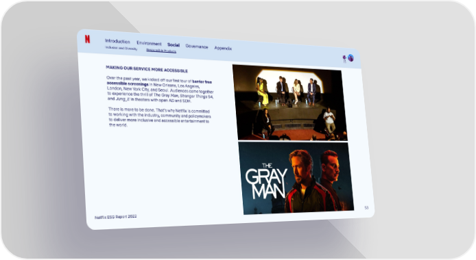 Introduction Environment Social Governance Appendix Inclusion and Diversity Responsible Products MAKING OUR SERVICE MORE ACCESSIBLE Over the past year, we kicked off our first tour of barrier free accessible screenings in New Orleans, Los Angeles, London, New York City, and Seoul. Audiences came together to experience the thrill of The Gray Man, Stranger Things S4, and Jung_E in theaters with open AD and SDH. There is more to be done. That’s why Netflix is committed to working with the industry, community and policymakers to deliver more inclusive and accessible entertainment to the world. Netflix ESG Report 2022 5353