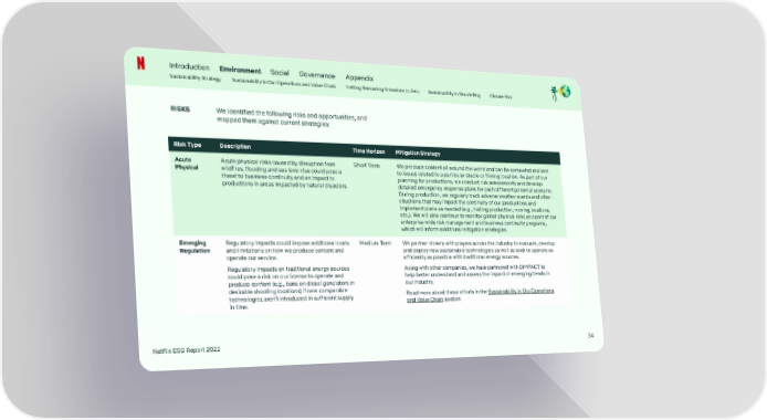 Introduction Environment Social Governance Appendix Sustainability Strategy Sustainability in Our Operations and Value Chain Netting Remaining Emissions to Zero Sustainability in Storytelling Climate Risk RISKS We identified the following risks and opportunities, and mapped them against current strategies: Risk Type Description Time Horizon Mitigation Strategy Acute Acute physical risks caused by disruption from Short Term We produce content all around the world and can be somewhat resilient Physical wildfires, flooding and sea level rise could pose a to issues related to a particular studio or filming location. As part of our threat to business continuity and an impact to planning for productions, we conduct risk assessments and develop productions in areas impacted by natural disasters. detailed emergency response plans for each different potential scenario. During production, we regularly track adverse weather events and other situations that may impact the continuity of our productions and implement plans as needed (e.g., halting production, moving locations, etc.). We will also continue to monitor global physical risks as a part of our enterprise wide risk management and business continuity programs, which will inform additional mitigation strategies. Emerging Regulatory impacts could impose additional costs Medium Term We partner closely with players across the industry to evaluate, develop Regulation and limitations on how we produce content and and deploy new sustainable technologies as well as seek to operate as operate our service. efficiently as possible with traditional energy sources. Regulatory impacts on traditional energy sources Along with other companies, we have partnered with DIMPACT to could pose a risk on our license to operate and help better understand and assess the impact of emerging trends in produce content (e.g., bans on diesel generators in our industry. desirable shooting locations) if new comparable Read more about these efforts in the Sustainability in Our Operations technologies aren’t introduced in sufficient supply and Value Chain section in time. Netflix ESG Report 2022 34