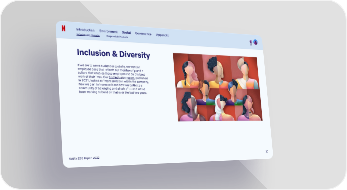 Introduction Environment Social Governance Appendix Inclusion and Diversity Responsible Products Inclusion & Diversity If we are to serve audiences globally, we want an employee base that reflects our membership and a culture that enables those employees to do the best work of their lives. Our first inclusion report, published in 2021, looked at “representation within the company, how we plan to increase it and how we cultivate a community of belonging and allyship” — and we’ve been working to build on that over the last two years. Netflix ESG Report 2022 37