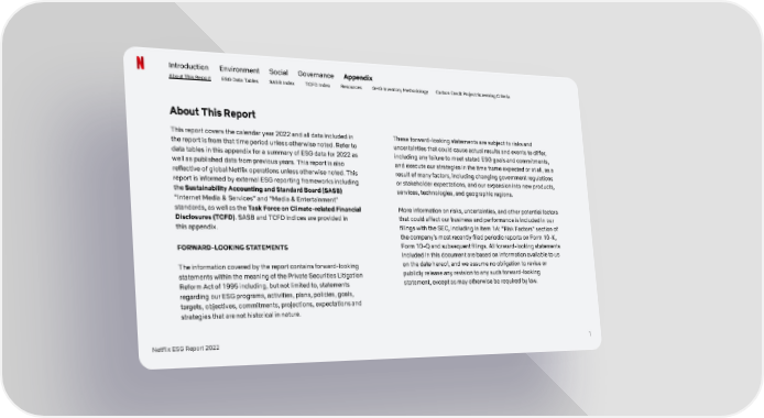 Introduction Environment Social Governance Appendix About This Report ESG Data Tables SASB Index TCFD Index Resources GHG Inventory Methodology Carbon Credit Project Screening Criteria About This Report This report covers the calendar year 2022 and all data included in These forward-looking statements are subject to risks and the report is from that time period unless otherwise noted. Refer to uncertainties that could cause actual results and events to differ, data tables in this appendix for a summary of ESG data for 2022 as including any failure to meet stated ESG goals and commitments, well as published data from previous years. This report is also and execute our strategies in the time frame expected or at all, as a reflective of global Netflix operations unless otherwise noted. This result of many factors, including changing government regulations report is informed by external ESG reporting frameworks including or stakeholder expectations, and our expansion into new products, the Sustainability Accounting and Standard Board (SASB) services, technologies, and geographic regions. “Internet Media & Services” and “Media & Entertainment” standards, as well as the Task Force on Climate-related Financial More information on risks, uncertainties, and other potential factors Disclosures (TCFD). SASB and TCFD indices are provided in that could affect our business and performance is included in our this appendix. filings with the SEC, including in Item 1A: “Risk Factors” section of the company’s most recently filed periodic reports on Form 10-K, Form 10-Q and subsequent filings. All forward-looking statements FORWARD-LOOKING STATEMENTS included in this document are based on information available to us on the date hereof, and we assume no obligation to revise or The information covered by the report contains forward-looking publicly release any revision to any such forward-looking statements within the meaning of the Private Securities Litigation statement, except as may otherwise be required by law. Reform Act of 1995 including, but not limited to, statements regarding our ESG programs, activities, plans, policies, goals, targets, objectives, commitments, projections, expectations and strategies that are not historical in nature. Netflix ESG Report 2022 1