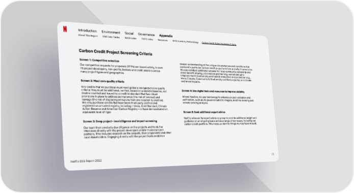 Introduction Environment Social Governance Appendix About This Report ESG Data Tables SASB Index TCFD Index Resources GHG Inventory Methodology Carbon Credit Project Screening Criteria Carbon Credit Project Screening Criteria Screen 1: Competitive selection deeper understanding of the unique circumstances and conditions that surround a particular carbon credit project and how and why it came to be. Our competitive requests for proposals (RFPs) are issued widely, to over We also conduct additional screens for: local community ownership and 75 project developers, non-profits, brokers and credit retailers across direct benefit sharing; job creation and training; women and girls many project types and geographies. empowerment; biodiversity and habitat restoration and protection (e.g., Verra Climate, Community & Biodiversity certified projects); and climate resilience impacts. Screen 2: Meet core quality criteria Any credits that we purchase must meet globally recognized core quality Screen 4: Use digital tools and resources to improve visibility criteria: they must be additional, verified, based on a realistic baseline, not double counted and issued by a credible standard that has robust Where feasible, we use technology to enhance project validation and provisions in place to address permanence (the risk of reversal) and verification, such as AI-powered satellite imagery, machine learning and leakage (the risk of displacing emissions from one location to another). remote sensing analysis. We only purchase credits that have been third-party verified and registered on a trusted registry, including – Verra, Gold Standard, Climate Action Reserve and American Carbon Registry – or have demonstrated an Screen 5: Seek additional expert advice equivalent level of rigor. Netflix relies on its expert advisory group to provide additional insight and Screen 3: Deep project- level diligence and impact screening guidance on an ongoing basis across a range of key issues, including our carbon credit portfolio. This helps us identify things we may have missed. Our team then conducts due diligence on the projects and holds live interviews directly with the project developers and/or trusted project partners. This includes research on the projects, their proponents and other local stakeholders. Engaging directly with the project hosts enables a Netflix ESG Report 2022 13