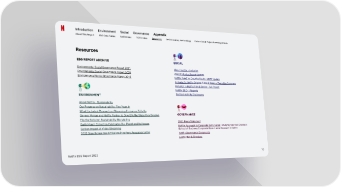 Introduction Environment Social Governance Appendix About This Report ESG Data Tables SASB Index TCFD Index Resources GHG Inventory Methodology Carbon Credit Project Screening Criteria Resources ESG REPORT ARCHIVE SOCIAL Environmental Social Governance Report 2021 About Netflix - Inclusion Environmental Social Governance Report 2020 2022 Inclusion Report Update Environmental Social Governance Report 2019 Netflix Fund for Creative Equity l 2023 Update Inclusion in Netflix Original Films & Series - Executive Summary Inclusion in Netflix Film & Series - Full Report Netflix EEO-1 Reports Political Activity Disclosures ENVIRONMENT About Netflix - Sustainability Our Progress on Sustainability: Two Years In What the Latest Research on Streaming Emissions Tells Us GOVERNANCE General Motors and Netflix Partner to Give EVs the Stage they Deserve Flip the Script on Sustainability Storytelling 2023 Proxy Statement Earth Month Collection Celebrates Our Planet and Its Heroes Netflix Approach to Corporate Governance l Study by Stanford Graduate Carbon Impact of Video Streaming School of Business Corporate Governance Research Initiative 2022 Greenhouse Gas Emissions Inventory Assurance Letter Netflix Governance Documents Leadership & Directors Netflix ESG Report 2022 10