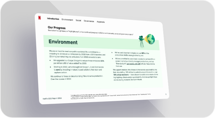 Introduction Environment Social Governance Appendix Our Progress 2 See below for a glimpse, or “highlights reel”, of our continued progress in 2022 on environmental, social and governance topics. Environment We are on track to meet our public sustainability commitments — ● We’ve used clean technologies on over 60% of the including to: (1) halve our emissions by 2030 from a 2019 baseline; and productions Netflix manages directly; and (2) bring our remaining net emissions from 2022 onwards to zero. ● We’ve committed to use at least one electric vehicle (EV) on ● We upgraded our Scope 3 target to reduce these emissions 55% screen in all of our directly managed productions, and our 3 per million USD of value added by 2030. “Everybody In” partnership with GM will also help promote their use. ● Starting in 2022, we’ve brought net Scope 1, 2 and 3 emissions to zero by investing in nature-based solutions that retain and We support creators who choose to incorporate sustainability into capture carbon. their storytelling. 165 million households around the world — over 70% of our members — have chosen to watch one or more stories We continue to focus on decarbonizing film and series production. highlighting climate and/or sustainability. And we spotlight these Over the course of 2022: stories during moments like Earth Month. 2 All data points are for the 2022 calendar year unless otherwise noted. 3 “ Value Added” is a term used by SBTi. For Netflix, this is synonymous with “Gross Profit,” derived from subtracting “Cost of Revenues” from “Total Revenue” for the Netflix ESG Report 2022 6 business, per our public financial statements.