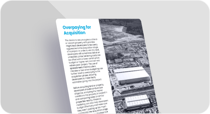 Overpaying for Acquisition The desire to secure a piece of land or vacant property with promise might lead developers to be overly aggressive in the acquisition stage of a project. In order to win the deal, developers will sometimes bid at an unrealistic price, believing costs can be offset with a lower construction budget or higher rent and sell-out values post-project. The use of spreadsheets that include a mistake or two when budgeting can further lead to overpaying in the acquisition phase, allowing developers to make faulty estimates going into the project. Before acquiring land or property, developers should conduct due diligence, analyzing the market conditions the property is located in and comparing sales on similar properties nearby. Financial modeling can also help developers budget effectively and make sure they aren’t putting up too much capital into the acquisition stage. Modern real estate development software can help developers analyze budgets on a given project, adjusting for different contingencies while incorporating past project data and market trends to generate a budget that is accurate. By leveraging technology to model financial outcomes, developers can better understand how much to spend in the acquisition stage and ensure a project will deliver ROI. 17