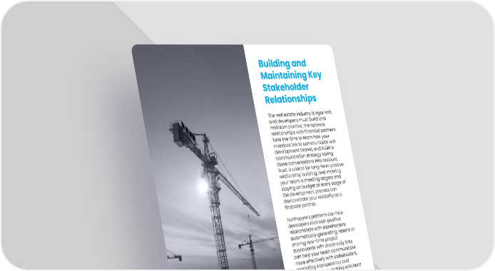 Building and Maintaining Key Stakeholder Relationships The real estate industry is tight-knit, and developers must build and maintain positive, transparent relationships with financial partners. Take the time to learn how your investors like to communicate with development teams, and build a communication strategy taking those conversations into account. Trust is critical for long-term positive relationship building, and showing your team is meeting targets and staying on budget at every stage of the development process can demonstrate your reliability as a financial partner. Northspyre’s platform can help developers maintain positive relationships with stakeholders; automatically generating reports or sharing real-time project dashboards with share-only links can help your team communicate more effectively with stakeholders, promoting transparency and backing decision-making with hard data. 14