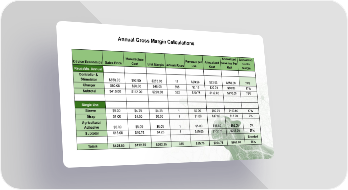 Annual Gross Margin Calculations 9.2M dairy cows & 95M beef cows in US alone Low startup risk - SG&A, R&D nearly paid for Introductory gross margin on 500 units = $194 / 63.6% Margin improves with Device Economics Sales Price Manufacture Cost Unit Margin Annual Uses Revenue per use Annualized Cost Annualized Revenue Per Unit Annualized Gross Margin Reusable- Annual Controller & Stimulator $350.00 $92.00 $258.00 17 $20.59 $92.00 $350.00 74% Charger $60.00 $20.00 $40.00 365 $0.16 $20.00 $60.00 67% Subtotal $410.00 $112.00 $298.00 382 $20.75 $112.00 $410.00 73% Single Use Sleeve $9.00 $4.75 $4.25 1 $9.00 $80.75 $153.00 47% Strap $1.00 $1.00 $0.00 1 $1.00 $17.00 $17.00 0% Agricultural Adhesive $5.00 $5.00 $0.00 1 $5.00 $85.00 $85.00 0% Subtotal $15.00 $10.75 $4.25 3 $15.00 $182.75 $255.00 28% Blended Totals $425.00 $122.75 $302.25 385 $35.75 $294.75 $665.00 56%