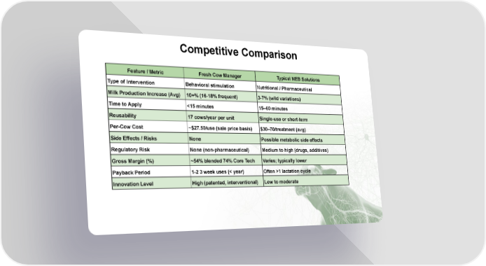 Competitive Comparison 9.2M dairy cows & 95M beef cows in US alone Low startup risk - SG&A, R&D nearly paid for Introductory gross margin on 500 units = $194 / 63.6% Margin improves with Feature / Metric Fresh Cow Manager Typical NEB Solutions Type of Intervention Behavioral stimulation Nutritional / Pharmaceutical Milk Production Increase (Avg) 10+% (16-18% frequent) 3-7% (wild variations) Time to Apply <15 minutes 1560 minutes Reusability 17 cows/year per unit Single-use or short-term Per-Cow Cost ~$27.50/use (sale price basis) $3070/treatment (avg) Side Effects / Risks None Possible metabolic side effects Regulatory Risk None (non-pharmaceutical) Medium to high (drugs, additives) Gross Margin (%) ~54% blended 74% Core Tech Varies; typically lower Payback Period 1-2 3 week uses (< year) Often >1 lactation cycle Innovation Level High (patented, interventional) Low to moderate