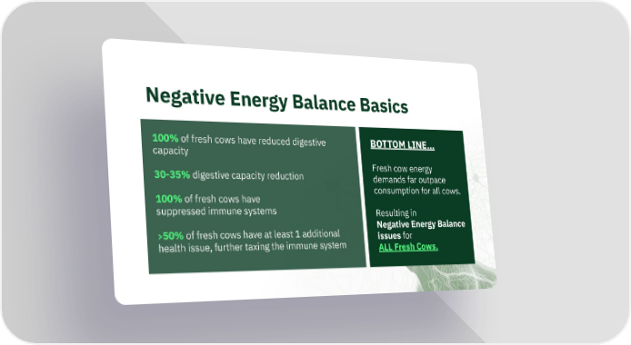 Negative Energy Balance Basics 100% of fresh cows have reduced digestive capacity 30-35% digestive capacity reduction 100% of fresh cows have suppressed immune systems > 50% of fresh cows have at least 1 additional health issue, further taxing the immune system BOTTOM LINE... Fresh cow energy demands far outpace consumption. Resulting in Negative Energy Balance for ALL Fresh Cows.