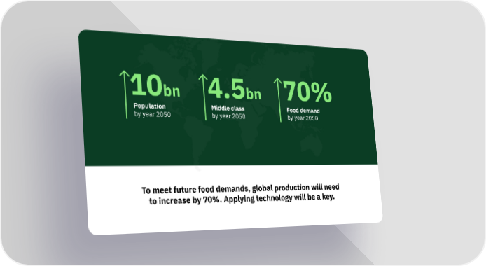 10 bn Population by year 2050 4.5 bn Middle class by year 2050 70% Food demand by year 2050 To meet future food demands, global production will need to increase by 70%. Applying technology will be a key.