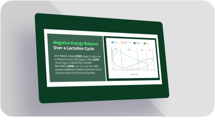 Negative Energy Balance Over a Lactation Cycle Dry Matter Intake (DMI) doesnt catch up to demand until 140 Days In Milk (DIM) , resulting in a NEGATIVE ENERGY BALANCE (NEB) over that period. NEB causes its own problems which further drains the Immune System.