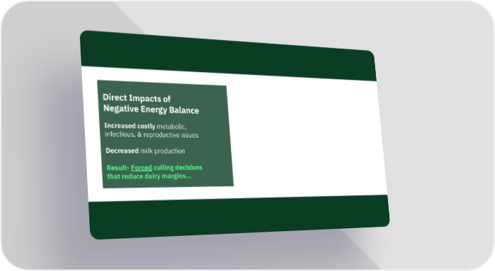 Decreased milk production Impacts of Negative Energy Balance Increased costly metabolic, infectious, & reproductive issues Result- Forced culling decisions that reduce dairy margins...