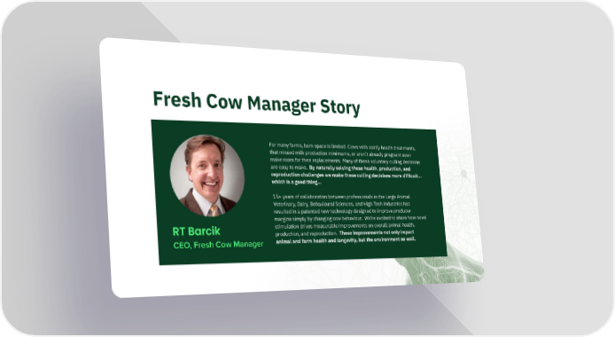 RT Barcik CEO, Fresh Cow Manager Fresh Cow Manager Story For many farms, barn space is limited. Cows with costly health treatments, that missed milk production minimums, or arent already pregnant soon make room for their replacements. Many of these voluntary culling decisions are easy to make. By naturally solving these health, production, and reproduction challenges we make these culling decisions more difficult... which is a good thing... 15+ years of collaboration between professionals in the Large Animal Veterinary, Dairy, Behavioural Sciences, and High Technology industries has resulted in a patented new technology designed to improve producer margins simply by changing cow behaviour. Were excited to share how novel stimulation drives measurable improvements on overall animal health, production, and reproduction. These improvements not only impact animal and farm health and longevity, but the environment as well.