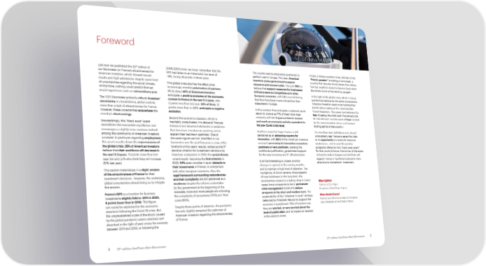 Foreword th Last year we published the 20 edition of 2008-2009 crisis, we must remember that the The country seems adequately positioned to Finally, in these uncertain times, the fear of the our Barometer on France’s attractiveness for NPS had fallen to an historically low level of perform well in Europe. This year, American “French paradox” is making a come back: a American investors, which showed record -74%, losing 46 points in three years. investors praise government’s support country that absorbs shocks better than others, results and high satisfaction despite some level This global crisis also has the effect of an measures and recovery plan. They are 96% to but that might be slower to bounce-back when of uncertainties regarding the social climate. increasingly sizeable polarization of opinions. believe that support measures for businesses the whole world will be starting up again. At that time, nothing could predict that we While about 40% of American investors in France were as competitive as in other In the light of the global crisis, which is laying would experience such an extraordinary year. anticipate a positive evolution of the economic European countries, with 54% even believing out the foundations for the world of tomorrow, The 2021 Barometer primarily reflects investors’ context in France in the next 2-3 years, only that they have been more competitive than American investors seem to be holding their uncertainty in a bewildering global context, 2 points less than last year, 23% of them, 12 elsewhere in Europe. breath when looking at this unpredictable more than a lack of attractiveness for France. points more than in 2019, anticipate a negative In this context, they anticipate a relatively quick French trajectory. They seem torn between the However, these uncertainties exacerbate the evolution. return to normal as 77% of them think their fear of seeing the crisis push France back into country’s shortcomings. Beyond the economic situation, which is company will take 2 years or less to recover its “old demons” and the wave of hope created Unsurprisingly, this “black swan” event inevitably complicated, it is above all France’s and reach an economic activity equivalent to by the new innovation-driven and forward destabilizes the immutable equilibrium and historical and structural obstacles or weakness the pre- Covid crisis level. looking spirits of the country - encourages a slightly more cautious outlook that American investors are pointing out to Another reason for hope: France is still This AmCham Bain 2021 Barometer should among the community of American investors explain their decline in optimism. One of perceived as an attractive country for undoubtedly lead France to seize this crisis surveyed. In particular regarding employment, the weak signals we had identified in our innovation, with 86% of the American investors as an opportunity to correct its historical this year’s results shows the repercussions of barometer over the past few years is now at the surveyed perceiving its innovation ecosystem weaknesses , and to seize the positive the global crisis: 28% of American investors forefront of this years’ results: ranked as the 5th positively or very positively, praising the prospects offered by this “black swan event” believe that their workforce will decrease in decisive criterion for investment decisions by workforce qualification, government support for the country’s future. France has all the levers the next 2-3 years, 21 points more than last American companies in 2019, the social climate for the new economy and IT infrastructures. in hand to make it happen and AmCham will year, for only 27% who think they will increase -unanimously- becomes the first criterion in It will be interesting to closely monitor support France in its efforts to become more (51% last year). 2020. 54% even consider it as an obstacle to changes in opinion in the coming months, attractive to transatlantic investment. This caution materializes in a slight erosion their investments in France, in comparison and to maintain a high level of attention. The of the attractiveness of France for their with other European countries. Also, the multiplicity of Covid variants, the prospects investment decisions. However, the underlying legal framework surrounding redundancies of new lockdowns in the long term, the global uncertainties should bring us to mitigate and their complexity are still perceived as a uncertainties related to a lasting drop in Covid weakness despite the reforms undertaken Bijan Eghbal this erosion. by the government at the beginning of the cases, force companies to be in permanent Partner at DLA Piper France’s NPS as a location for business mandate; more and more people are criticizing crisis management mode and reduce President of AmCham France investments slightly fells to -20% in 2020, the complexity of procedures (73%) and their prospects in the short and medium term. The costs (80%). sustainability of the “whatever it costs” strategy Marc-André Kamel 8 points lower than in 2019. This figure defended by President Macron to support the Partner and Director at Bain & Company can easily be explained by the economic Despite these points of attention, the pandemic economy is questioned: 70% of investors say Vice-President of AmCham France downturn following the Covid-19 crisis. But has only slightly tempered the optimism of they are worried, or very worried about the the unprecedented scale of the shock caused American investors regarding the attractiveness level of public debt, and its impact on taxation by the global pandemic seems relatively well of France. in the years to come. absorbed in the light of past crises: for example, between 2011 and 2014, or following the st st 4 21 edition AmCham-Bain Barometer 21 edition AmCham-Bain Barometer 5
