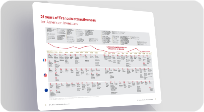 21 years of France’s attractiveness for American investors First annual 45– of companies did France faces an §eaders of French 8– of investors consider Folloing 2 ears of global Strong decrease of the satisfaction of US barometer on France's not create obs after increasingl global subsidiaries of US that the election of ”inancial crisis, investors are investors in France folloing François attractiveness for the enactment of the competition, companies fear the ‡resident Saro¤ ill more optimistic regarding ¥ollande’s election and term US investors bill setting oring especiall from negative impact from have a positive impact the economic situation time at 5 hoursªee ƒastern ƒurope the deterioration of on foreign investment n 2012, ¦85– of the n 2015, France remains not so ƒmmanuel ’acron’s election 1,250 US companies and …sia Franco“…merican in France ¥oever, France's surveed e„ecutives attractive compared to Uœ, as ‡resident of France drives are established in …merican companies relations attractiveness is don thin that the Šerman and the ‰etherlands‹ US investors’ optimism up France, providing perceive the French France historical ith onl 4– €2010‚ and ta„ation and he economic and social 458,000 direct and ecosstem as drabacs remain ‘nl 0– of US Œollapse of the satisfaction 5– €2011‚ of investors regulation measures situation, labor ©uali”ication 1,50,000 indirect favorable to ne the same« a rigid investors predict an of US investors regarding considering it a ‘good’ announced ill and cost, as ell as ta„ation, … troubled social and economic obs technologies organi¤ation of labor improvement of the the evolution of the or ‘e„cellent’ destination‹ penali¤e France’s remain the most important climate at the global, ƒuropean and an unfavorable economic conte„t economic conte„t he ere up to – attractiveness criteria for investment and French scales slos don ”iscal polic in 200• decisions investors’ optimism SATISFACTION OF AMERICAN INVESTORS IN FRANCE * 1999 2000 2001 2002 2003 2004 2005 2006 2007 2008 2009 2010 2011 2012 2013 2014 2015 2016 2017 2018 2019 2020 2021 he “Aubry” la nauguration Jacques Chirac he reform of Œlosure of the Rejection of —emonstration Nicolas —eath of the France oins Stries against a France taes ƒlection of —emonstrations ncrease of the Terror attacs Nice terror ƒlection of he “Gilets —eath of he government sets the legal of the ins the civil servant's last French the ƒuropean against the CPE Sarkozy’s last ™™ "Poilu" NATO integrated pension sstem on the role of François in favor and VAT in France in France attacks on Emmanuel Jaunes” Jacques Chirac announces a oring time at emploment second round pension sstem coal mine in Œonstitution b election ”ighter command reform beteen G8 rotating Hollande as against same“se„ €from 1•‹– to ˆastille —a Macron movement series of 5 hours a ee bonus €ended of ‡residential trigers heav ’oselle referendum in September and ‡residenc ‡resident marriage bill 20– and from Œreation of the poisons the Notre-Dame measures to ”ight in 2015‚ elections stries‹ France France accounts ‘ctober 2010 Ž– to 10–‚ CICE and removal ¦50 taxes social climate de Paris in the pandemic at against e„treme Œontribution Smoking ban for more than 2 Dominique “’ enem is ƒntrepreneurs of the “ta„ on the created since for long ”lames ¨hatever cost¨‹ ƒnd of right candidate period is ˆegining of in public places million web users Strauss-Kahn is ”inance” protest and high“income 2010 for • he countr military service e„tended to riots in the arrested in ‰žŒ ncrease of constitute the orers” removed adapts to Crash of the 40 ears, up French suburbs Unemploment ban charges “pigeons ©uarantine and Œoncorde, that from Ž,5 ears at Œlich“ reaches •‹– movement” mages of Air curfe connected ƒ„plosion of the sous“ˆois of the oring France ¥£ Social conlict ‡aris and …†F plant in population, a —irector assaulted in France over ‰e žor in oulouse resulting record since 2001 b compan pension reform hrs 0 min in 2,500 inured orers mae the and 0 dead nes orldide Geroge W. 9/11 France ˆeginning George US trade Saddam ˆeginning of Barack Obama’s General Motors ˆarac ‘bama ƒnd of the £e“election of ˆoston End of the Severe tensions ƒlection Withdrawal of Withdrawal of Rising pressures ƒ„plosion of the Bush elected attacs opposes of the war W. Bush is de”icit reaches Hussein is the subprime is elected goes banrupt announces he ar in Iraq Barack Obama marathon ar in folloing the of Donald the US from the the US from beteen Covid cases in the ‡resident the US on war in Iraq reelected unprecendente sentenced to crisis ‡resident ants to reform attacs …fghanistan deaths of two Trump ‡aris the nuclear ™ashington US, ith over in Iraq ‡resident d levels and death and the ”inancial Oussama Ben Afro-American agreement on agreement and eheran 40,000 deaths e„ecuted in he real sstem folloing is illed in citizens killed b climate ith ran household Laden George debt reaches ra© estate maret ˆanruptc the crisis ‡aistan the police Donald Trump Joe Biden is elected W. Bush signs 1•– of collapses of Lehman Bernard Madoff ensions increasingl as 4th ‡resident of the ‡atriot …ct income level Brothers mars is sentenced to he US are leading to ithdras from the US the beginning 150 ears in deprived from several international of the global prison their “AAA” rating shutdowns scene First Œovid case in ˆeginning of ”inancial crisis for the ”irst time in the Œhina, in Wuhan the ar in b S¢‡ administration ŠŽ agreement Afghanistan on GAFA taxation France taes he ‰ice treat Euro Signature of a ƒnlargement he ƒU starts he domain Romania and The crisis hits Angela Merkel ƒurope n ˆrussels, ƒU receives Croat
