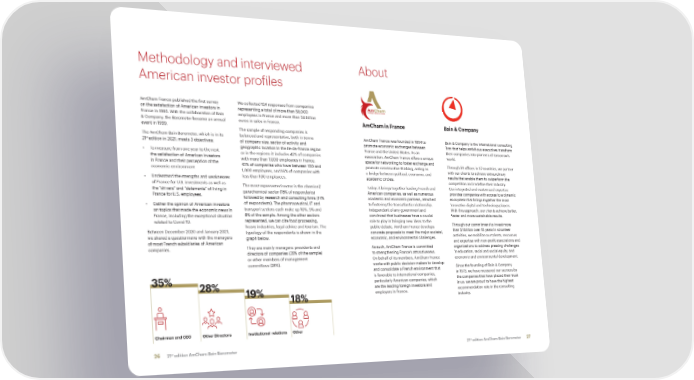 Methodology and interviewed About American investor profiles AmCham France published the first survey We collected 124 responses from companies on the satisfaction of American investors in representing a total of more than 58,000 France in 1995. With the collaboration of Bain employees in France and more than 54 billion & Company, the Barometer became an annual euros in sales in France. AmCham in France Bain & Company event in 1999. The sample of responding companies is The AmCham-Bain Barometer, which is in its balanced and representative, both in terms AmCham France was founded in 1894 to Bain & Company is the international consulting st 21 edition in 2021, meets 3 objectives: of company size, sector of activity and promote economic exchanges between firm that helps ambitious executives transform • To measure from one year to the next geographic location in the Ile-de-France region France and the United States. As an their companies into pioneers of tomorrow’s the satisfaction of American investors or in the regions: it includes 42% of companies association, AmCham France offers a unique world. in France and their perception of the with more than 1,000 employees in France, space for networking to foster exchange and Through 59 offices in 37 countries, we partner economic environment 42% of companies who have between 100 and promote constructive thinking, acting as with our clients to achieve extraordinary 1,000 employees, and 16% of companies with a bridge between political, economic, and results that enable them to outperform the • Understand the strengths and weaknesses less than 100 employees. academic circles. competition and redefine their industry. of France for U.S. investments as well as The most represented sector is the chemical/ Today, it brings together leading French and Our integrated and customized expertise the “drivers” and “deterrents” of living in parachemical sector (15% of respondents) American companies, as well as numerous provides companies with access to a dynamic France for U.S. employees. followed by research and consulting firms (14% academic and economic partners, attached ecosystem that brings together the most • Gather the opinion of American investors of respondents). The pharmaceutical, IT and to fostering the transatlantic relationship. innovative digital and technology players. on topics that made the economic news in transport sectors each make up 10%, 9% and Independent of any government and With this approach, our clients achieve better, France, including the exceptional situation 8% of the sample. Among the other sectors convinced that businesses have a crucial faster and more sustainable results. related to Covid-19. represented, we can cite food processing, role to play in bringing new ideas to the Through our commitment to invest more heavy industries, legal advice and tourism. The public debate, AmCham France develops than $1 billion over 10 years in volunteer Between December 2020 and January 2021, typology of the respondents is shown in the concrete proposals to meet the major societal, we shared a questionnaire with the managers graph below. economic, and environmental challenges. activities, we mobilize our talents, resources of most French subsidiaries of American and expertise with non-profit associations and companies. They are mainly managers: presidents and As such, AmCham France is committed organizations to address pressing challenges directors of companies (35% of the sample) to strengthening France’s attractiveness. in education, racial and social equity, and or other members of management On behalf of its members, AmCham France economic and environmental development. committees (28%). works with public decision-makers to develop Since the founding of Bain & Company and consolidate a French environment that in 1973, we have measured our success by 35% is favorable to international companies, the companies that have placed their trust 28% particularly American companies, which in us: we are proud to have the highest are the leading foreign investors and recommendation rate in the consulting 19% 18% employers in France. industry. Chairman and CEOOther Directors Institutional relations Other st st 26 21 edition AmCham-Bain Barometer 21 edition AmCham-Bain Barometer 27