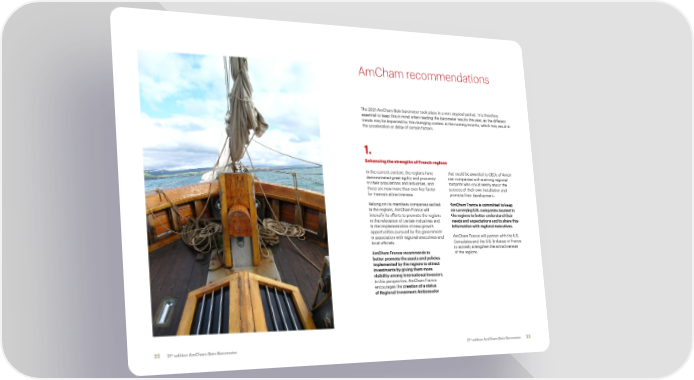 AmCham recommendations The 2021 AmCham-Bain barometer took place in a very atypical period. It is therefore essential to keep this in mind when reading the barometer results this year, as the different trends may be impacted by this changing context in the coming months, which may result in the acceleration or delay of certain factors. 1. Enhancing the strengths of French regions In the current context, the regions have that could be awarded to CEOs of Ameri- demonstrated great agility and proximity can companies with a strong regional to their populations and industries, and footprint who could testify about the these are now more than ever key factor success of their own installation and for France’s attractiveness. promote their development. Relying on its members companies settled AmCham France is committed to keep in the regions, AmCham France will on surveying U.S. companies located in intensify its efforts to promote the regions the regions to better understand their in the relocation of certain industries and needs and expectations and to share this in the implementation of new growth information with regional executives. opportunities pursued by the government in association with regional executives and AmCham France will partner with the U.S. local officials. Consulates and the U.S. Embassy in France to actively strengthen the attractiveness AmCham France recommends to of the regions. better promote the assets and policies implemented by the regions to attract investments by giving them more visibility among international investors. In this perspective, AmCham France encourages the creation of a status of Regional Investment Ambassador st st 22 21 edition AmCham-Bain Barometer 21 edition AmCham-Bain Barometer 23
