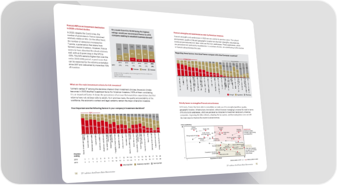 France’s NPS as an investment destination On a scale from 0 to 10 (10 being the highest France’s strengths and weaknesses as seen by American investors in 2020: a limited decline rating), would you recommend France to a U.S. France’s strengths and weaknesses in 2020 are very similar to previous years. The cultural In 2020, despite the Covid crisis, the company seeking to establish business abroad? environment, quality of life and geographic location are the main strengths; redundancies number of promoters in France remained (costs and procedures) and labor costs are the main weaknesses. These weaknesses, which relatively stable at 16%. On the other hand, are persistent and particularly troublesome in a context of crisis, are contributing to the decline the number of detractors increased by in France’s attractiveness this year. 7 points, a polarization that stems from 33% 29% 29% 36% formerly neutral investors. However, France 65% 54% Regarding those factors, how does France compare with other European countries? seems to have absorbed the shock relatively 46% 58% 54% well, with an 8-point drop in the NPS to 47% -20%. This NPS remains higher than over the 32% 43% STRENGTHS WEAKNESSES 3% 3% 21% 14% 17% 16% 21% 25% 30% 11% 12% 19% 27% entire 2009-2016 period, a good score that 36% 40% 44% 49% 54% 57% 58% 46% can be explained by the reforms undertaken 2015 2016 2017 2018 2019 2020 50% 62% 73% 73% 69% NPS* -62% -51% -12% -15% -12% -20% 61% 62% 80% since 2017 and welcomed by more than 70% 78% 67% of investors. Promoter Neutral Detractor 73% 69% 60% 56% 54% 71% 52% 46% 44% 39% 41% 39% 25% 30% 33% 28% 26% 24% 18% (*) Net Promoter Score (NPS) = % promoters (grade of 9 to 10) - % detractors 14% 7% (grade of 0 to 6) e D y s h y y R t y y s s s s Note : in percentage of answers. Quality of lif proceduresFlexibilit companies Complexity of What are the main investment criteria for U.S. investors? and innovation private service Legal certaintrkforce availabilitEconomic contexSocial climate andpolitical stabilitof working hourRelocation costRedundancy cost th Cultural environmentGeographic locationrkforce qualificationInfrastructure qualitQuality of public andWo Simplicity of admin. x system for foreign rkforce overall cost Formerly ranked 5 among the decisive criteria in their investment choices, the social climate Wo Opportunities for R& Energy supply and costBanking sector strengtImportance given to CS Ta redundancy proceduresWo becomes in 2020 the first investment factor for American investors, 100% of them considering Strength Equivalent Weakness it is an important factor. It shows the persistence of an issue that crystallizes expectations but that reforms have not yet been able to satisfy. As in previous years, the quality and availability of the workforce, the economic context and legal certainty remain the major criteria for investors. Priority levers to strengthen France’s attractiveness How important are the following factors in your company’s investment decisions? In 10 years, France has been able to consolidate or make use of its strengths (workforce quality, geographic location, infrastructure, innovation), without however managing to reverse the trend in terms TOP 5 of its structural weaknesses, which are perceived as obstacles for investment decisions by American 21% 7% 8% 9% 10% 12% 15% 17% 18% 18% 20% 23% 25% companies. Improving the labor climate, adapting the tax system, and decreasing labor costs are still 31% 26% 27% 37% 30% 36% 33% 37% the main ways to improve the country’s attractiveness. 44% 34% 45% 46% 33% 49% 41% 38% 46% 60% 50% 51% 79% 72% 70% 53% 37% France positioning 68% 61% 67% 60% 58% 49% 43% 45% 42% 43% 43% 49% 35% + Cultural Geographic 1 2 3 4 5 24% 26% 24% 25% environment Quality of life location 14% Workforce Assets to use y t y y s s y s e s s y D R e h Quality of public Infrastructure qualification Workforce, location, and private services quality innovation, legal certainty stabilit Energy supply and cost R&D and infrastructure service Legal companiesprocedures procedures Banking sector Importance Workforce availability certainty Legal certaint Relocation cost and innovationQuality of lif strength given to CSR Economic contexrkforce qualificationrkforce availabilitrkforce overall costx system for foreignSimplicity of admin.Geographic locationInfrastructure qualitRedundancy costCultural environment Economic context Wo Wo Ta Opportunities for R& Relocation costs Social climate and political Priorities for Wo Banking sector strengtEnergy supply and cost Flexibility Tax system stability Previous Social climate and political Flexibility of working hour Complexity of redundancImportance given to CS of working hours improvement ranking Quality of public and privat Admin. procedures for foreign companies Costs, labor legislation, Complexity of redundancy tax regime and adminis- 2018 371 52869410 12 14 n.a. 11 13 15 16 18 17 19 20 procedures Workforce trative procedures, Redundancy costs overall costs social climate 2019 513 124671312 0914 n.a. 11 815161817 19 20 - - Importance of criteria + Very important Relatively important Not important Criteria position in 2011 Criteria position in 2020 st st 14 21 edition AmCham-Bain Barometer 21 edition AmCham-Bain Barometer 15