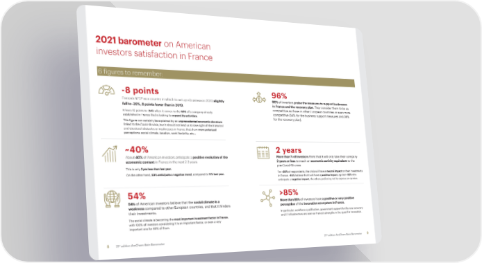 2021 barometer on American investors satisfaction in France 6 figures to remember: -8 points 96% France’s NPS® as a country in which to set up a business in 2020 slightly 96% of investors praise the measures to support businesses fell to -20%, 8 points lower than in 2019. in France and the recovery plan. They consider them to be as competitive as those in other European countries or even more It loses 12 points to -24% when it comes to the NPS of a company already competitive (54% for the business support measures and 39% established in France that is looking to expand its activities. for the recovery plan). This figure can certainly be explained by an unprecedented economic downturn linked to the Covid-19 crisis, but it should not lead us to lose sight of the historical and structural obstacles or weaknesses in France that show more polarized perceptions: social climate, taxation, work flexibility, etc... ~40% 2 years About 40% of American investors anticipate a positive evolution of the More than ¾ of investors think that it will only take their company economic context in France in the next 2-3 years 2 years or less to reach an economic activity equivalent to the This is only 2 pts less than last year. pre-Covid-19 crisis On the other hand, 23% anticipate a negative trend, compared to 11% last year. For ~60% of respondents, the crisis will have a neutral impact on their investments in France. ~10% believe that it will have a positive impact, against ~25% who anticipate a negative impact, the others preferring not to express an opinion. 54% >85% 54% of American investors believe that the social climate is a More than 85% of investors have a positive or very positive weakness compared to other European countries, and that it hinders perception of the innovation ecosystem in France. their investments. In particular, workforce qualification, government support for the new economy The social climate is becoming the most important investment factor in France, and IT infrastructure are seen as France’s strengths in the quest for innovation. with 100% of investors considering it is an important factor, or even a very important one for 80% of them. st st 8 21 edition AmCham-Bain Barometer 21 edition AmCham-Bain Barometer 9