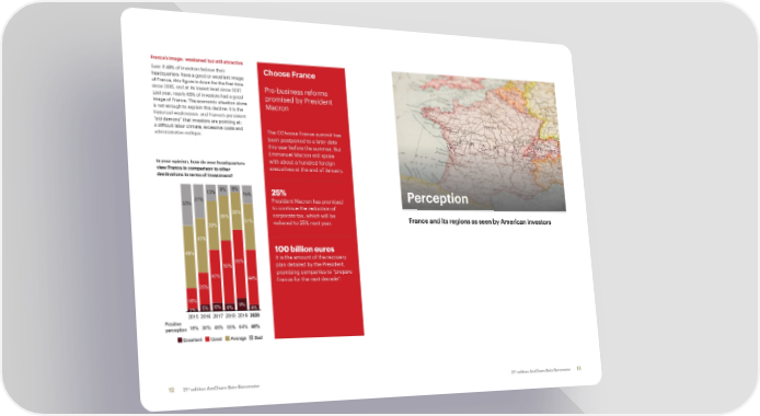 France’s image: weakened but still attractive Even if 48% of investors believe their Choose France headquarters have a good or excellent image of France, this figure is down for the first time Pro-business reforms since 2015, and at its lowest level since 2017. Last year, nearly 65% of investors had a good promised by President image of France. The economic situation alone Macron is not enough to explain this decline: it is the historical weaknesses and France’s persistent “old demons” that investors are pointing at: a difficult labor climate, excessive costs and The CChoose France summit has administrative redtape. been postponed to a later date this year before the summer. But Emmanuel Macron still spoke In your opinion, how do your headquarters with about a hundred foreign view France in comparison to other executives at the end of January. destinations in terms of investment? 13% 9% 6% 25% 15% Perception 33% 27% President Macron has promised 30% to continue the reduction of 36% corporate tax, which will be France and its regions as seen by American investors 39% 37% reduced to 25% next year. 43% 49% 100 billion euros 55% It is the amount of the recovery 50% plan detailed by the President, 42% promising companies to “prepare 44% France for the next decade”. 25% 16% 9% 2% 5% 6% 6% 4% 2015 2016 2017 2018 2019 2020 Positive 18% 30% 48% 55% 64% 48% perception Excellent Good Average Bad st st 12 21 edition AmCham-Bain Barometer 21 edition AmCham-Bain Barometer 13