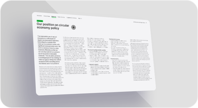 Introduction Climate Change Resources Smarter Chemistry Engagement and Advocacy Appendix 2023 Environmental Progress Report 47 Feature Our position on circular economy policy The responsible use of natural Over the last year, Apple has reached new milestones Policy can help accelerate progress. A thriving, Improving material recovery: Apple is working to realize a circular economy through resources is a critical part of in our products and our efforts to demonstrate what’s responsible, circular economy supports critically • Support the development of efficient collection policy engagement and advocacy. Apple’s environmental objectives. possible in circularity. We’re aiming for even greater use important health, safety, and environmental protections. It programs that engage customers, protect Apple supports the ratification of the Basel Convention by Extracting the materials that of recycled content in our products. Our commitments can also enable closed loop supply chains to be cost and environmental and human health, and capture high the United States. This would help enable circular supply include using 100 percent recycled cobalt — a critical operationally competitive with linear models. Harmonized volumes of electronics for reuse, repair, refurbishment, chains and address some current barriers to efficient make up our products comes with mineral — in Apple-designed batteries and using policies can remove barriers and drive the transition to and recycling. materials recovery and reuse. The Basel Convention significant environmental costs. We 100 percent recycled rare earth elements in all magnets, circularity by meeting the following high-level objectives: • Waste regulations should be consistent and is the global regulatory framework guiding how some work to minimize these by using both by 2025. 60 And advancements in recycling harmonized across geographies, enabling efficient, technology help make this possible. For example, cobalt Sourcing and recycling materials responsibly: commercially viable movement of materials. Such waste — including electronics and e-scrap — can materials efficiently so that we recovered from iPhone batteries disassembled by Daisy • Policies should seek to improve strict labor, human policies can drive maximum materials recovery, be moved for recovery, recycling, and disposal. The can one day build all our products is returned to the market. And Taz — which we developed rights, and environmental standards throughout prevent downcycling, and help enable parity with convention provides critical environmental and social out of recycled or renewable as an alternative to traditional shredders for breaking recycled and primary materials supply chains. newly mined resources while maintaining critical protections, especially against moving hazardous waste down electronics — enables us to recover even greater • Circularity should be a priority for policies that aim to environmental and social protections. to geographies that lack the resources to manage it in materials. This circularity ambition amounts of rare earth elements. This more efficient and address sources of supply over new ways or locations an environmentally sound manner. Countries that have is an integral part of our strategy to economical approach makes these materials available to for resource extraction. Recycling electronics will help Improving recycling: ratified the convention can move materials covered by the meet our goal of being fully carbon others beyond our supply chain. unlock the valuable materials in those devices for • Incentivize the inclusion of recycled content in agreement among themselves, following the agreement’s neutral in 2030, including across reuse, reducing reliance on newly mined resources. products by supporting the generation of increased, regulatory requirements. the lifetime use of our products. We’ve also expanded our Self Service Repair program high-quality material supply, including improving The U.S. is one of a very small number of countries not from iPhone 12 and iPhone 13 to include MacBook Air Designing for longevity: waste collection and recycling infrastructure, the party to the Basel Convention. This imposes restrictions Global demand for electronics is increasing, and with it, and MacBook Pro notebooks with the M1 family of chips. • Policies should strive to maximize product longevity development of global waste treatment standards, on the movement of Basel-controlled wastes for recycling so is the demand for the materials that make up those This makes repair manuals and genuine Apple parts while minimizing environmental impact, by enabling and recycled content quality standards. or resource recovery into or from the U.S. to nearly all products. Awareness is growing of the finite nature of and tools available to customers through the Apple Self the optimal balance between designing for reliability • Support the development of advanced electronics other countries in the world, requiring specific trade some of these resources, such as critical minerals or rare Service Repair Store. We continue to build, support, and ease of repair. recycling facilities that can recover more types of agreements with another country. The U.S. ratifying the earth elements — as well as of the complex, globally and participate in circular supply chains. But challenges • Ecodesign policies are most effective in delivering resources, including materials that are difficult to convention would unlock more efficient movement of interrelated nature of the supply chains that electronics remain to achieve fully circular electronics supply chains. environmental benefits when they’re product-specific recover or of lower value. material to high-quality electronics recycling facilities, rely on. Circularity plays an important role in helping and globally aligned. helping scale circularity and the available supply realize environmental benefits while bu