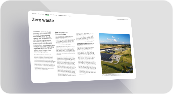 Introduction Climate Change Resources Smarter Chemistry Engagement and Advocacy Appendix 2023 Environmental Progress Report 52 Zero waste All waste that gets sent to landfill Reducing waste at our to reusable alternatives. These certifications also reflect comes with costs. These can be corporate facilities efforts working and coordinating with local partners, from measured in the resources and composters to specialty recyclers capable of handling We’re reducing the amount of waste generated in our specific waste streams, like plastic wraps and foams. By emissions that go into discarded corporate operations and directing more to recycling partnering with these providers, we’re able to support the materials. And, too often, the most programs — an effort that has continued since launching local economies engaging in recycling and composting as vulnerable communities around our Zero Waste Program in 2018. Initially we focused on an alternative to municipal waste disposal programs. the world carry a disproportionate U.S. campuses and retail locations. Since then, we’ve grown in the U.S. and around the world while remaining Promoting material reuse, composting, and burden of these costs and others committed to sending zero waste to landfill. waste diversion across our corporate and associated with waste disposal. We’re retail locations working to change this by prioritizing In 2022, recycling and composting efforts allowed us to As our company grows and changes, we’ve prioritized waste-free operations at our own achieve a waste diversion rate of 71 percent — up from finding opportunities to recycle construction and 68 percent in 2021 — limiting landfill waste from our demolition waste. In 2022, we achieved a waste facilities as well as those of our global operations to about 16, 000 m etric tons. 68 Despite diversion rate of 83 percent — approximately manufacturing suppliers. occupancy increases during our transition from COVID- 23, 500 m etric tons — from corporate office and data related temporary closures, our overall waste generated center construction and demolition projects through At our offices, retail locations, data centers, and remained l ow. recycling and source separation efforts. We expanded construction sites, we’re implementing systems and source separation efforts for our corporate office and approaches to avoid sending waste to landfill. We’re We haven’t interrupted our efforts to make progress data center construction projects — from 7. 2 percent asking our manufacturing suppliers to do the same. on waste diversion since achieving our first zero-waste participation in 2021 to 36 percent across projects Our focus is on eliminating waste generated during certification, UL’s Zero Waste to Landfill validation, in in 2022. The locations using this approach saw a manufacturing and engaging with local specialty recyclers 2015 for our campus in Cork, Ireland. In 2023, our Taiwan 10 percent higher overall diversion rate. An example of and composters to redirect materials from landfills. This Technology Center became the second Apple facility the effectiveness of source separation is our new office requires innovation and collaboration with local partners to receive the UL Solutions Zero Waste to Landfill in Battersea Power Station in London, United Kingdom. to make the best use of our resources. We measure our validation. 69 And our data center in Viborg, Denmark, Our team there achieved a 98 percent diversion rate of progress in the amount of waste that we divert at the became the third facility to receive TRUE certification construction waste, including 300 tons of drywall, one- source and by our ability to protect the communities in 2023, joining our data centers in Mesa, Arizona, and fifth of which was directed to agricultural uses such as where we and our suppliers operate. Prineville, Oregon. 70 These facilities achieved TRUE mushroom cultivation and farming. The project reused Platinum, the highest certification level. TRUE recognizes timber onsite and donated key construction materials, facilities that divert more than 90 percent of waste including plasterboard, for local uses. The location also for recycling, compost, or reuse. To accomplish this, recycled personal protective equipment used during we improved waste separation through infrastructure construction and build-out. upgrades and moved away from single-use materials In 2023, our Viborg, Denmark, facility became the third to receive TRUE Platinum certification, which requires more than 90 percent of waste from a facility to be recycled, composted, or redirected for reuse.