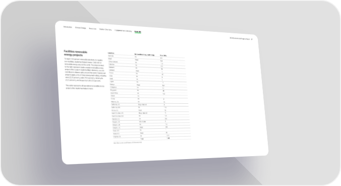 Introduction Climate Change Resources Smarter Chemistry Engagement and Advocacy Appendix 2023 Environmental Progress Report 87 Facilities renewable Location Renewable energy technology Size (MW) energy projects Australia PV 0.5 Brazil Wind 0.5 To reach 100 percent renewable electricity for Apple’s China mainland PV 130 own facilities, Apple has helped create 1, 549 M W of Colombia PV 0.2 renewable energy around the world. The projects listed Denmark PV 42 to the right represent Apple-created renewable energy projects that support Apple facilities’ electricity use and Denmark Wind 17 contribute to cleaner grids around the world. Operational France PV