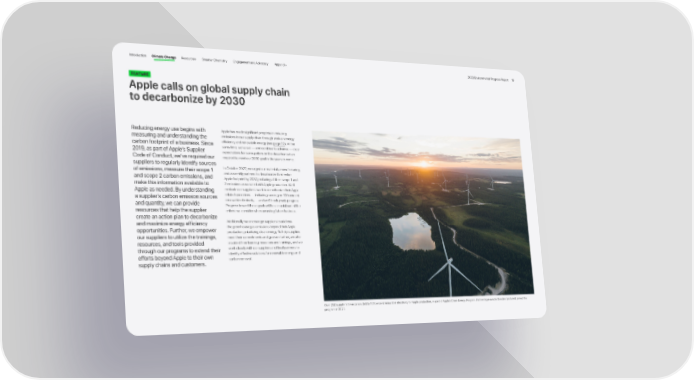 Introduction Climate Change Resources Smarter Chemistry Engagement and Advocacy Appendix 2023 Environmental Progress Report 19 Feature Apple calls on global supply chain to decarbonize by 2030 Reducing energy use begins with Apple has made significant progress in reducing measuring and understanding the emissions in our supply chain through work on energy carbon footprint of a business. Since efficiency and renewable energy (see page 22 ). At the 2019, as part of Apple’s Supplier same time, we’ve set — and continue to advance — clear Code of Conduct, we’ve required our expectations for our suppliers on the decarbonization required to meet our 2030 goal in the years to come. suppliers to regularly identify sources of emissions, measure their scope 1 In October 2022, we urged our materials, manufacturing, and scope 2 carbon emissions, and and assembly partners to decarbonize their entire make this information available to Apple footprint by 2030, including all their scope 1 and 2 emissions associated with Apple production. We’ll Apple as needed. By understanding evaluate our suppliers’ work to decarbonize their Apple- a supplier’s carbon emission sources related operations — including running on 100 percent and quantity, we can provide renewable electricity — and we’ll track yearly progress. resources that help the supplier Progress toward these goals will be a crucial part of the criteria we consider when awarding future business. create an action plan to decarbonize and maximize energy efficiency Additionally, we encourage suppliers to address opportunities. Further, we empower the greenhouse gas emissions beyond their Apple production, prioritizing clean energy. To help suppliers our suppliers to utilize the trainings, meet their commitments and go even further, we offer resources, and tools provided a suite of free learning resources and trainings, and we through our programs to extend their work closely with our suppliers and local partners to efforts beyond Apple to their own identify effective solutions for renewable energy and supply chains and customers. carbon removal. Over 250 suppliers have committed to 100 percent renewable electricity for Apple production, as part of Apple’s Clean Energy Program. Holmen Iggesund in Sweden (pictured) joined the program in 2023.