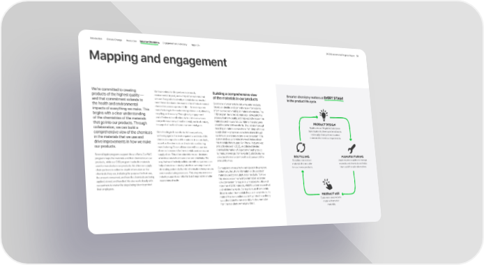 Introduction Climate Change Resources Smarter Chemistry Engagement and Advocacy Appendix 2023 Environmental Progress Report 59 Mapping and engagement We’re committed to creating We have criteria for the performance needs, Building a comprehensive view Smarter chemistry matters at every stage products of the highest quality — environmental impact, and safety of the materials that of the materials in our products in the product life cycle and that commitment extends to we use. Our goal is to identify material chemistries that meet these standards. We examine the effects of material Good data is fundamental to delivering safer products. the health and environmental chemistries across a product’s life — from design and We rely on detailed and comprehensive information to impacts of everything we make. This manufacturing to the customer experience and, ultimately, inform our decision-making on material chemistries. The begins with a clear understanding recycling and recovery. Through early engagement FMD program, launched six years ago, is integral to this of the chemistries of the materials and effective data collection, we’re able to develop a process. It aims to catalog and map each chemical in the comprehensive view of each material, and its chemistry, materials used in our products. Material manufacturers Product design that go into our products. Through in support of our health and environmental goals. are at the center of these efforts. They provide thorough Apple uses our Regulated Substance collaboration, we can build a reporting on material compositions from deep within our Specification to drive our internal teams comprehensive view of the chemicals We’re leading in these efforts. With our partners, supply chain — proprietary data that’s shared through and supply chain partners to select in the materials that we use and we’re engaged in the work required to understand the our innovative and secure data collection system. This materials that meet our requirements. chemical composition of the materials in our products, system enables us to make informed choices about drive improvements in how we make as well as the chemicals and materials used during the materials that are used. For iPhone, iPad, and Mac our products. manufacturing. Close collaboration with our partners products released in 2022, we collected detailed allows us to account for the materials used across our chemical information of 91 percent of each product Several Apple programs support these efforts. Our FMD supply chain. This information informs our decisions by mass, on average. For the Apple Studio Display, we program maps the materials and their chemistries in our when it comes to health and environmental risks. The collected information on more than 93 percent of the Recycling Manufacturing products, while our CSD program tracks the materials way that we effectively collaborate with our partners can product by mass. Recyclers can recover Apple requires suppliers to manage used to manufacture our products. We drive our supply help others in our industry take their own steps toward materials that are safer materials and chemicals and helps chain partners to collect in-depth information on the eliminating potentially harmful chemicals in their products Our suppliers are required to participate in the program. for use in new products. them switch to safer alternatives. chemicals they use, including the purpose for their use, and manufacturing processes. This progress across our Collectively, they share information on thousands of the amount consumed, and how the chemicals are being industry supports our effort to build responsible circular materials used to manufacture our products. To make applied, stored, and handled. We also work closely with economies at scale. this process easier, we’ve implemented an advanced our partners to review the steps being taken to protect collection system for suppliers with access to a library of their employees. more than 47, 000 m aterials, which have been researched and validated by Apple. Our suppliers use this materials library to select the materials they use in our products. If a material that our supplier uses isn’t yet listed in our library, Product use we authenticate the new material with documentation Customers use products from the manufacturer that provides it. made with smarter materials.