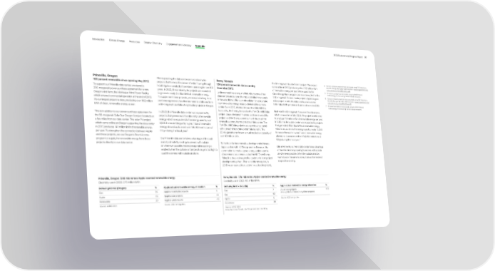 Introduction Climate Change Resources Smarter Chemistry Engagement and Advocacy Appendix 2023 Environmental Progress Report 90 Prineville, Oregon Also supporting the data center are two microhydro Reno, Nevada the 50-megawatt Boulder Solar II project. This project 4 Carbon emissions equivalences calculated using 2021 data from 100 percent renewable since opening May 2012 projects that harness the power of water flowing through 100 percent renewable since opening came online in 2017, producing about 137 m illion kWh the U.S. Energy Information Administration: www.eia.gov/electricity/ local irrigation canals that have been operating for over 60 December 2012 of renewable energy per year. We’ve used the NV sales_revenue_price/pdf/table5_a.pdf . To support our Prineville data center, we signed a 5 Emissions avoided are calculated using the GHG Protocol 200-megawatt power purchase agreement for a new years. In 2022, these microhydro projects are expected Unlike competitive energy markets where some of our GreenEnergy Rider program two more times, first for the methodology for calculating market-based emissions. Oregon wind farm, the Montague Wind Power Facility, to generate nearly 2 m illion kWh of renewable energy. data centers are located, the regulated electricity supply 200-megawatt Techren II solar project. Apple’s largest 6 Carbon emissions equivalences calculated using 2021 data from To supplement these projects, we executed a long-term solar project to date, it’s estimated to produce over the U.S. Energy Information Administration: www.eia.gov/electricity/ which entered commercial operation at the end of 2019. in Nevada did not offer a simple solution for us to create sales_revenue_price/pdf/table5_a.pdf . It’s our largest project to date, producing over 562 m illion purchase agreement for all environmental attributes from new renewable energy projects dedicated to our data 540 m illion kWh per year and came online in late 2019. 7 Emissions avoided are calculated using the GHG Protocol kWh of clean, renewable energy a year. a 69-megawatt portfolio of eight solar projects in Oregon. center. So, in 2013, we created a partnership with the methodology for calculating market-based emissions. local utility, NV Energy, to develop the Fort Churchill Solar Next was the 50-megawatt Turquoise Nevada project, This is in addition to our power purchase agreement for In 2022, the Prineville data center was supported by project. Apple designed, financed, and constructed the which came online in late 2020. The project is estimated the 56-megawatt Solar Star Oregon II project located just projects that generated 275 m illion kWh of renewable project, and NV Energy operates it and directs all the to produce 110 m illion kWh of renewable energy per year. a few miles from our data center. This solar PV project, energy, which is equivalent to the energy used by over renewable energy it produces to our data center. The In 2022, the Reno data center was supported by projects which came online and began supporting the data center 8,000 homes in Oregon for a year. 4 Use of renewable Fort Churchill Solar project uses a photovoltaic panel that generated 419 m illion kWh of renewable energy, in 2017, produces 141 m illion kWh of renewable energy energy allowed us to avoid over 196, 000 m etric tons of with curved mirrors that concentrate sunlight. The which is equivalent to the energy used by nearly 12,000 per year. To strengthen the connection between Apple CO 2 e during the fiscal year. 5 20-megawatt array has an annual production capacity of homes in Nevada for a year. 6 Use of renewable energy and these projects, we use Oregon’s Direct Access over 40 m illion kWh. allowed us to avoid more than 145, 000 m etric tons of program to supply the renewable energy from these Our Prineville data center takes advantage of the cool CO 2 e during the fiscal year. 7 projects directly to our data center. and dry climate by cooling its servers with outside To facilitate further renewable development in Nevada, air whenever possible. Indirect evaporative cooling is Apple worked with NV Energy and the Nevada utility Like in Prineville, our Reno data center takes advantage enabled when the outside air temperature gets too high to commission to create a green energy option open to of the mild climate by cooling its servers with outside cool the servers with outside air alone. all commercial customers, called the NV GreenEnergy air whenever possible. When the outside air is too Rider, that does not require the customer to fund project warm to cool the servers alone, it draws from indirect development up front. Thanks to this new option, in evaporative cooling. 2015 we announced our second Nevada solar project, Prineville, Oregon: Grid mix versus Apple-sourced renewable energy Reno, Nevada: Grid mix versus Apple-sourced renewable energy Electricity use in 2022: 275 m illion kWh Electricity use in 2022: 419 m illion kWh Default grid mix (Oregon) % Apple actual renewable energy allocation % Default grid mix (Nevada) % Apple actual renewable energy allocation % Gas 35 Apple’s microhydro projects 1 Coal 7 Apple’s solar projects 100 Hydro 45 Apple’s solar projects 51 Gas 63 (through the NV GreenEnergy Rider program) Renewable 20 Apple’s wind projects 48 Hydro 5 Source: 2022 energy data. Source: eGRID 2021. Source: 2022 energy data. Renewable 26 Source: eGRID 2021. Note: Total doesn’t add up to 100 percent due to rounding.